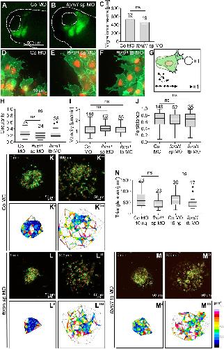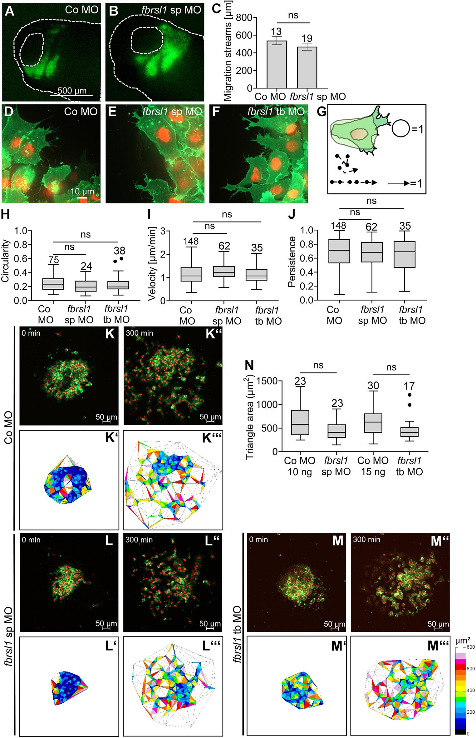 Fig. 3. Fbrsl1 loss of function does not affect the migration of NC cells. (A,B) Transplantation assay. Embryos were injected with 10 ng Co MO or 10 ng fbrsl1 sp MO in combination with either 150 pg mbGFP or mRFP mRNA. Fluorescently labeled NC cells were transplanted into wild-type embryos at stage 18 and NC cell migration was analyzed at stage 28. Fbrsl1-depleted NC cells showed no significant difference in migration compared to control cells. (C) Data from the experiments in A and B showing the average length of migration streams of the transplanted NC cells. Data are mean±s.e.m.; the number of analyzed transplants are indicated; ns, not significant (two-tailed unpaired Student's t-test). (D-N) Explant assay results. Embryos were injected with 10-15 ng Co MO (D,K-K‴), with 10 ng fbrsl1 sp MO (E,L-L‴) or with 15 ng fbrsl1 tb MO (F,M-M‴) in combination with 150 pg mbGFP RNA and 250 pg H2B mCherry mRNA. (D-F) NC cells were explanted at stage 18, cultivated for 2-3 h and imaged using spinning disk microscopy. (D) Co MO-injected explants form protrusions. (E,F) fbrsl1 morphant explants form protrusions. (G) Cell circularity and persistence of migration; a complete circle has a circularity of 1, cells migrating in a straight line have a persistence of 1. (H-J) Graphs analyzing cell shape (circularity) (H), speed (velocity) (I) or directionality (persistence) (J) revealing no difference in NC morphology and migration behavior. ns, not significant [Kruskal–Wallis test; boxplots indicate the median (horizontal line), the boxes extend from the 25th to the 75th percentile, with Tukey's whiskers set at 1.5 times the IQR, number of evaluated cells are indicated; dots represent outliers]. (K-M‴) NC cells were imaged for 5 h and NC dispersion was analyzed using Delaunay triangulation. Explants are shown at the start of the experiment (K-M) and after 5 h (K″-M″). The respective triangles between migrating cells are indicated in K′-M′ and K‴-M‴. Fbrsl1 loss of function did not lead to significant defects compared to control cells. (N) Boxplot showing mean triangle area per explant. ns, not significant (Kruskal–Wallis test). Boxplots indicate the median (horizontal line), the boxes extend from the 25th to the 75th percentile, with Tukey‘s whiskers set at 1.5 times the IQR. Numbers of evaluated explants are indicated; dots represent outliers. |