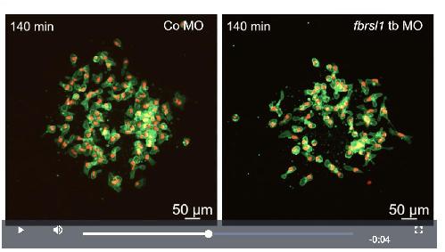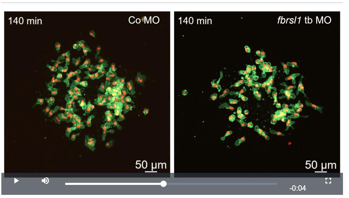 fbrsl1 MO-injected NC cells die earlier than Co MO-injected cells. Embryos were injected with 15 ng Co MO or with 15 ng fbrsl1 tb MO in combination with 150 pg mbGFP RNA and 250 pg H2B mCherry mRNA. NC cells were explanted at stage 18, cultivated for 2-3 h and imaged for 5 h using spinning disk microscopy. |
