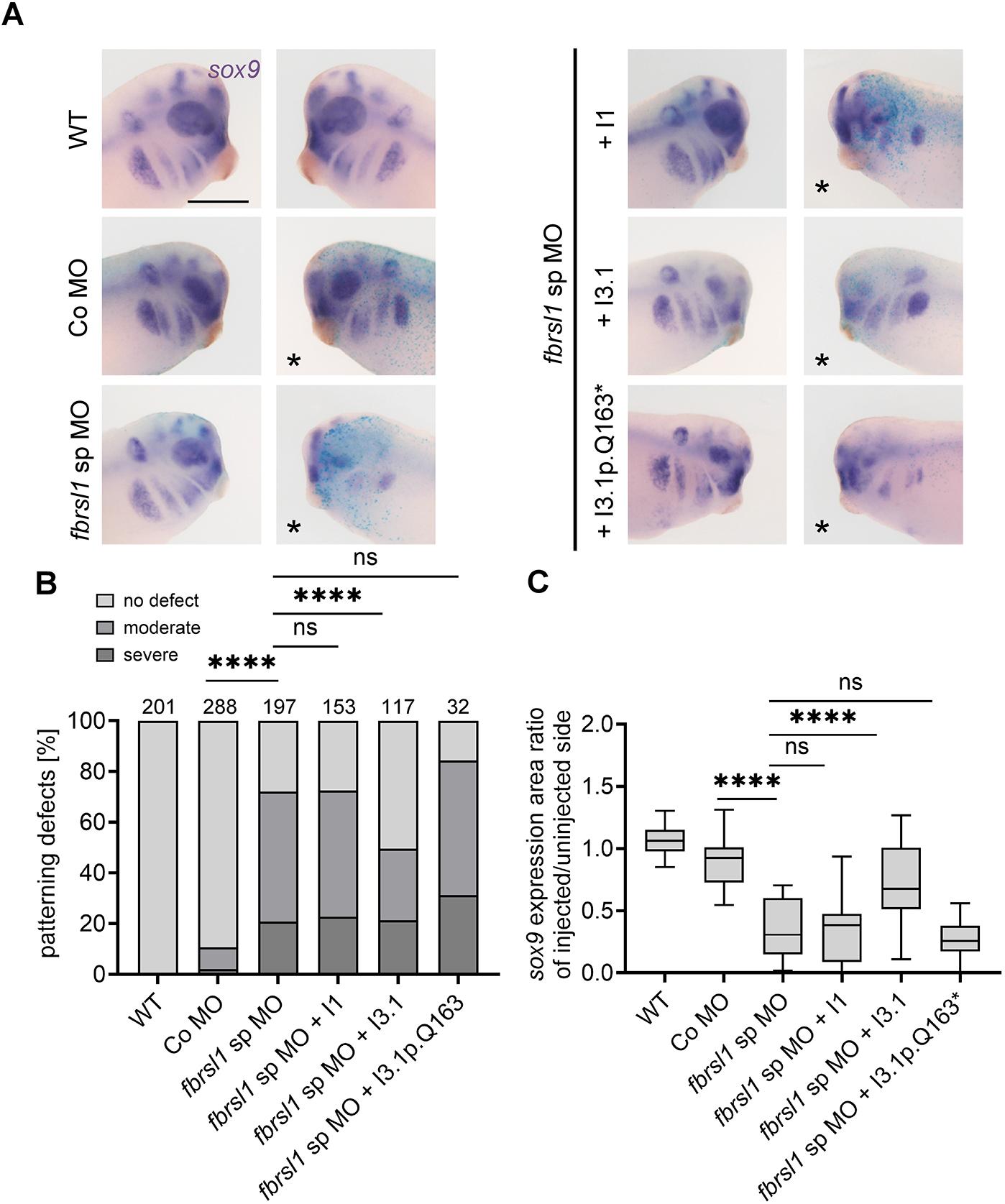 Fig. 2. NC patterning defects are partially rescued by the human short N-terminal FBRSL1 isoform. (A) Embryos were injected at the two-cell stage with 10 ng of the respective MO alone or in combination with 200 pg of the respective plasmids. 80 pg LacZ RNA was co-injected as a lineage tracer. Embryos were analyzed at stage 28 by sox9 whole-mount in situ hybridization. Embryos are shown from the lateral side. Scale bar: 500 µm. Injection of fbrsl1 sp MO caused a significant reduction of sox9 staining on the injected side compared to controls. Co-injection of the short human FBRSL1 isoform I3.1 was able to significantly restore this knockdown phenotype, whereas co-injection of the long isoform I1 or the short isoform I3.1p.Q163*, carrying a patient variant, were not. (B) Data in the graph are presented as a percentage of the total, based on at least three independent experiments. The numbers of analyzed embryos are indicated; ns, not significant. ****P≤0.0001 (two-sided Fisher's exact test). (C) Graph presenting the ratio of the sox9 expression area between the injected and the uninjected side of 20 randomly selected embryos per condition; ns, not significant. ****P≤0.0001 (one-way ANOVA with Tukey's multiple comparison test). Boxplots indicate the median (horizontal line), the boxes extend from the 25th to the 75th percentile, with Tukey's whiskers set at 1.5 times the IQR. |