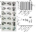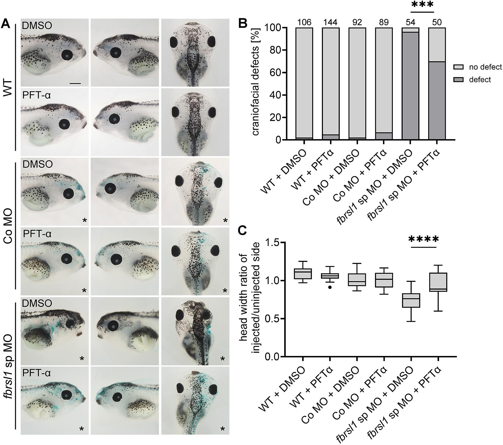Fig. 7. PFT-α treatment partially rescues craniofacial defects induced by Fbrsl1 depletion. Embryos were injected with 10 ng Co MO or 10 ng fbrsl1 sp MO, in combination with 100 pg lacZ RNA in one-blastomere at the two-cell stage. From stage 20 to stage 33, Xenopus embryos were incubated in 20 µM of the p53 inhibitor PFT-α (pifithrin-α) or in 0.1% DMSO as solvent control. PFT-α incubation results in a partial rescue of craniofacial defects induced by the injection of the fbrsl1 sp MO. PFT-α or DMSO incubation did not affect development of 10 ng Co MO-injected embryos. Dorsal views of representative embryos are shown. The injected side is marked with an asterisk. Scale bar: 500 µm. (B) Data in the graph are presented as the percentage of the total, based on three independent experiments; the number of analyzed embryos are indicated; ***P≤0.001 (two-sided Fisher's exact test). (C) Quantification of the ratio of the head width of the injected side in comparison to the uninjected side of 20 randomly selected embryos. ****P≤0.0001 (one-way ANOVA with Tukey's multiple comparison test). Boxplots with Tukey's whiskers set at 1.5 times the IQR, dots represent outliers; the median is indicated by a line within the box; the boxes extend from the 25th to the 75th percentile. |