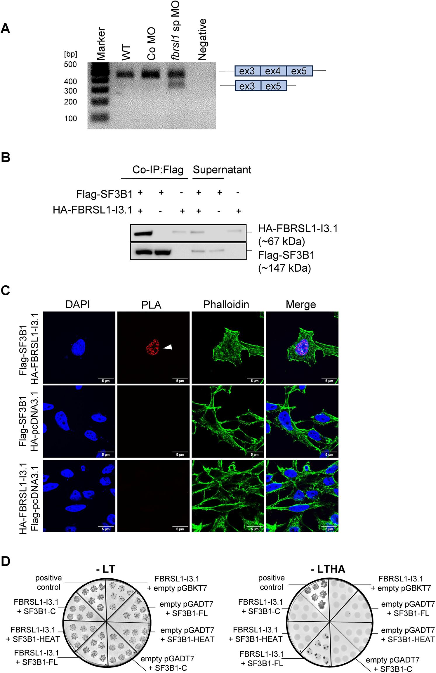 Fig. 8. FBRSL1-I3.1 interacts with the splicing factor SF3B1 and loss of Fbrsl1 function leads to increased exon 4 skipping in mdm2. (A) Embryos were injected with 20 ng Co MO or fbrsl1 sp MO at the one-cell stage, and RNA was isolated at stage 33 and reverse-transcribed into cDNA. PCR followed by agarose gel electrophoresis revealed an increased exon 4 skipping of mdm2 in Xenopus embryos with Fbrsl1 knockdown in comparison to wild-type (WT) or Co MO-injected embryos. ex, exon. (B) HEK293 cells were co-transfected with Flag-SF3B1 and HA-FBRSL1-I3.1. Co-immunoprecipitation was performed using an anti-Flag antibody, and precipitated proteins were detected by western blotting. Co-IP, co-immunoprecipitation. (C) Proximity ligation assay (PLA) showing the localization of the FBRSL1-SF3B1 association. Positive PLA signals (indicated by the white arrowhead) were observed after co-transfection of Flag-SF3B1 with HA-FBRSL1-I3.1, indicating an interaction in the nucleus. Co-transfection with empty vectors (Flag-pcDNA3.1 and HA-pcDNA3.1) served as negative controls. DNA was counterstained with DAPI, and the actin cytoskeleton was visualized using phalloidin. The images for Flag-SF3B1 HA-pcDNA3.1 are also shown in Fig. S6. (D) A yeast two-hybrid (Y2H) experiment revealing a direct interaction of FBRSL1 isoform I3.1 with SF3B1. A representative Y2H experiment showing colonies on the −LTHA selective plate after co-transformation of FBRSL1-I3.1 with full-length (FL) SF3B1, indicating a direct interaction. No colonies were observed after co-transformation with a C-terminal SF3B1 construct (SF3B1-C, amino acids 1100-1304) or the HEAT domain of SF3B1 (SF3B1-HEAT, amino acids 501-1304). The −leucine/−tryptophan (−LT) selective plates served as a control for co-transformation efficiency. Co-transformation of KMD6A with KMT2D-pt.8 served as a positive control. Auto-activation of bait and prey proteins was tested by co-transforming the constructs with the corresponding empty vector. |