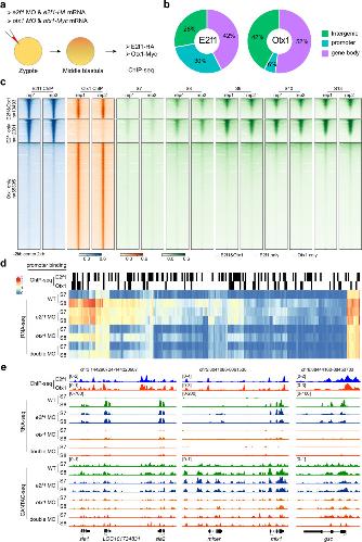 Fig. 6. E2f1 and Otx1 co-modulate minor ZGA.a A schematic view of the workflow of E2f1 and Otx1 ChIP-seq experiments. b Distribution of E2f1 and Otx1 binding sites at the promoter, gene body, and intergenic region. c Heatmaps of normalized read density of ChIP-seq (n = 2 biological replicates) for E2f1 and Otx1, as well as CANTAC-seq at five developmental stages. ChIP-peaks were categorized into three subgroups: E2f1-bound peaks (E2f1 only, n = 12,031), common peaks bound by E2f1 and Otx1 (E2f1&Otx1, n = 10,439), and Otx1-bound peaks (Otx1 only, n = 55,395). d Integrative heatmaps depicting the expression of E2f1 and Otx1 co-regulated genes (n = 220) in uninjected WT, e2f1 MO, otx1 MO, and double MO embryos at stages 7 and 8. Genes with E2f1 or Otx1 ChIP-peaks at promoter regions are marked in black. e Genome browser view of ChIP-seq, RNA-seq, and CANTAC-seq normalized read counts at sia1/2, mixer and mix1, and gsc loci. |