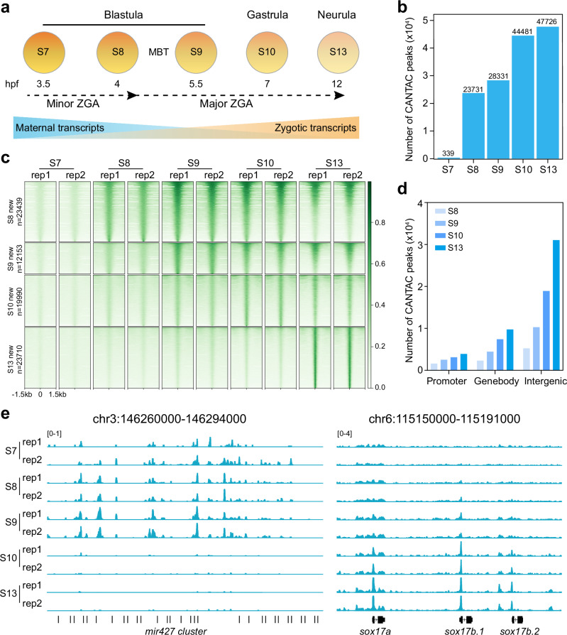 Fig. 2. Accessible chromatin landscape during X. tropicalis ZGA.a A schematic view of the five developmental stages examined by CANTAC-seq. Embryos were collected at 3.5 hpf, 4 hpf, 5.5 hpf, 7 hpf, and 12 hpf to generate genome-wide chromatin accessibility profiles for stages 7, 8, and 9 (blastula), 10 (gastrula), and 13 (neurula), respectively. ZGA zygotic genome activation, MBT midblastula transition, hpf hours post-fertilization. b The bar plot illustrates the number of accessible chromatin regions detected at each of the five developmental stages during ZGA. c Heatmaps of chromatin accessibility for the five developmental stages, two biological replicates for each stage. d The bar plot illustrates the number of newly gained accessible regions at different genomic locations during ZGA. e Genome browser view of two representative genomic regions that lose (mir427 cluster, chr3: 146,260,000–146,294,000) or gain (sox17 cluster, chr6: 115,150,000–115,191,000) chromatin accessibility during ZGA. Source data are provided in the Source Data file. |