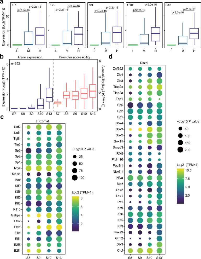 Fig. 3. Promoter accessibility, gene expression, and enriched DNA-binding motifs of TFs.a The bar plot illustrates the expression level (Log2 (TPM + 1)) of genes with different promoter accessibility at different developmental stages. “Low”, “medium” and “high” groups were classified by separating the promoters into three groups of equal size (n = 9500 genes in each group) based on their CANTAC signal strength. Statistical significance was determined using a paired two-sided Student’s t-test. b The bar plot illustrates the expression level (Log2 (TPM + 1)) and promoter accessibility (Log2 (CPM + 1)) of the genes expressed after MBT (n = 852 genes) at different developmental stages. c, d Heatmaps of transcription factor (TF) DNA binding sequence motifs identified from proximal and distal CANTAC-seq peaks gained at each developmental stage. Stage-specific motif activity (−Log10