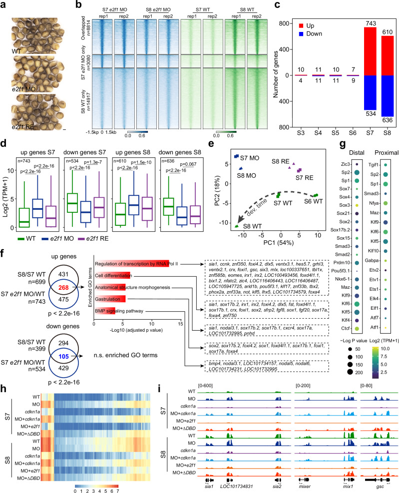 Fig. 4. E2f1 is a repressor of minor ZGA.a Representative bright field images of embryos (stage 23) showing that e2f1 MO embryos display abnormal morphology at early development, which could be partially rescued by co-injecting e2f1 MO and e2f1 mRNA. Scale bar, 200 μm. b Heatmaps of chromatin accessibility detected by CANTAC-seq at stages 7 and 8 upon e2f1 MO, n = 2 biological replicates. c The box plot illustrates the numbers of up- and down-regulated genes upon e2f1 MO at different developmental stages. d The box plot illustrates the expression level of the genes up- or down-regulated upon e2f1 MO in uninjected WT, e2f1 MO, and e2f1 rescue embryos (e2f1 RE) at stages 7 and 8. The results are presented as the median Log2 (TPM + 1), along with the 25th and 75th quartiles, as well as the 5th and 95th percentiles. Statistical significance was determined using a paired two-sided Student’s t-test, n indicates the number of genes in each condition. e Principal component analysis (PCA) of transcriptome profiles (n = 2 biological replicates) of uninjected embryos (WT), e2f1 MO embryos (MO), as well as e2f1 RE at stages 6–8. A developmental trajectory was indicated with a dashed line for the WT embryos. f Overlap between the up-/down-regulated genes upon e2f1 MO at stage 7 and those up-/down-regulated from stage 7 to stage 8 during normal development, and GO enrichment analysis of the overlapped genes. The P values were calculated based on a one-sided hypergeometric test. Whereas no significant GO terms were enriched for down-regulated genes, a set of GO terms for up-regulated genes was enriched, and genes were listed to the right. The enriched GO terms are ranked by –Log10 (adjusted P value). The adjusted P values for enrichment of specific GO terms were calculated by using the linear step-up method of Benjamini and Hochberg. g Heatmaps of TF DNA binding sequence motifs identified from gained proximal and distal CANTAC-seq peaks upon e2f1 MO at stage 7. Motif activity (–Log10