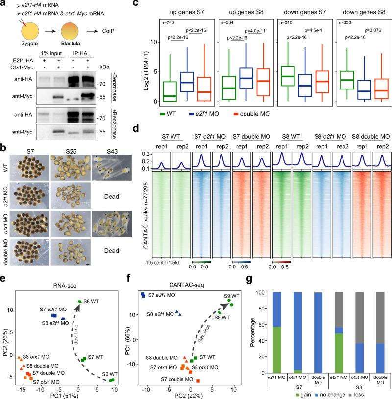 Fig. 5. Otx1, interacting with E2f1, acts as an activator.a Co-immunoprecipitation (IP) was carried out using the antibody against HA, followed by WB to detect HA-tagged E2f1 or Myc-tagged Otx1 using anti-HA or anti-Myc antibody, respectively, in embryos expressing both HA-tagged E2f1 and Myc-tagged Otx1. Embryos expressing only HA-tagged E2f1 were used as a negative control. Protein lysates were treated with or without benzonase nuclease. Input lanes represent 1% of the total protein lysate. Three independent experiments were performed, and similar results were obtained. b Representative bright field images of uninjected WT embryos, e2f1 MO embryos, otx1 MO embryos, as well as e2f1 and otx1 double MO embryos at stages 7, 25, and 43. Scale bar, 500 μm. c The box plot illustrates the expression of the genes up- or down-regulated upon e2f1 MO at stage 7 and 8 in uninjected WT, e2f1 MO, as well as e2f1 and otx1 double MO embryos. The results are presented as the median Log2 (TPM + 1), along with the 25th and 75th quartiles, as well as the 5th and 95th percentiles. Statistical significance was determined using a paired two-sided Student’s t-test, n indicates the number of genes in each condition. d Heatmaps of chromatin accessibility detected by CANTAC-seq at stage 7 and 8 upon e2f1 MO or e2f1 and otx1 double MO, n = 2 biological replicates. e PCA of transcriptome profiles (n = 2 biological replicates) of uninjected WT embryos, e2f1 MO embryos, otx1 MO embryos, as well as e2f1 and otx1 double MO embryos at stages 7 and 8. A developmental trajectory was indicated with a dashed line for the WT embryos. f PCA of chromatin accessibility profiles (n = 2 biological replicates) of uninjected WT embryos, e2f1 MO embryos, otx1 MO embryos, as well as e2f1 and otx1 double MO embryos at stages 7 and 8. A developmental trajectory was indicated with a dashed line for the WT embryos. g The bar plot illustrates the percentage of genes (n = 699) induced between stage 7 and 8 that gain, lose, or do not change chromatin accessibility upon e2f1 MO, otx1 MO, as well as double MO at stage 7 and stage 8. Genic region: from 10 kb upstream of the Transcription Start Site to 10 kb downstream of the Transcription End Site. Source data are provided in the Source Data file. |