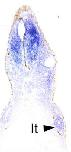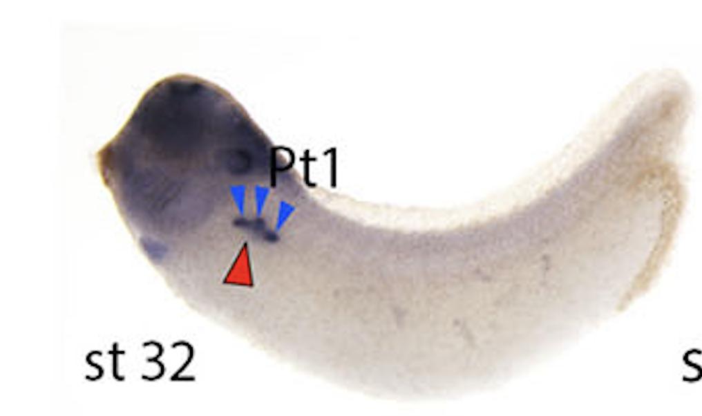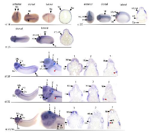 WISH analysis at stages ranging from early neurula stage 14 (appearance of the kidney field) to early tadpole stage 35/36 (functional pronephros). Anterior, dorsal and lateral views are shown at neurula stages (st14 and 20). Lateral and dorsal views are shown at tailbud stage 25. Only lateral views are shown for tailbud stages 28 and 32, and early tadpole (st35/36). At stage 14, 20 and 25, images of sectioned embryos are shown with red dotted lines, indicating the corresponding levels on whole mounts. For convenience, these levels are just indicated with arrows 1, 2, and 3 at stage 28, 32 and 35/36 (note that the sections were not made from the whole mount specimen shown). Efna3 starts to be detected in the developing tubule from the stage 28. It is detected prior to stage 28 in the developing nervous system and migrating cephalic neural crest cells. Efna3 is expressed at stage 14 in the primary neuronal precursors (Np), and weakly in the anterior neural folds (Nf). Neural expression expands at st20 to the closing neural tube (Nt). It is strong in the emerging first (n1) and third/fourth (n3, n4) branchial arches neural crest streams. Cg: cement gland. At stage 25, efna3 expression is strong in branchial neural crest streams populating the first arch around the eye rudiment (n1), as well as the third and fourth arches (n3, n4). It is also detected in the dorsal neural tube (Nt). Efna3 is also expressed in the proctodeal region (Pr). At stage 28, efna3 is now expressed in the ventral region of the pronephric anlage (red arrowhead). It is detected in the dorsal region of the midbrain (Mb) and in the hindbrain (Hb), as well as in the developing branchial arches (Ba). In addition to the first branchial arch around the eye (n1), and the third and fourth branchial arches (n3, n4), efna3 is now also detected in the second branchial arch (n2). Expression of efna3 is observed in developing neural placodes, in the epidermis overlying the optic vesicle that contains the lens placode (Lp), in the ventral region of the otic vesicle (Ov) and in the developing posterior lateral line placode (Pp, blue arrowhead). Efna3 is also detected in the proctodeal region (Pr). Pronephric expression at stage 32 is very strong in a region of the tubule at the origin of the intermediate and distal segments (red arrowhead). Efna3 continues to be detected in the anterior midbrain (Mb) and in a hindbrain (Hb) region likely corresponding to rhombomere 4. It continues to be detected in the four branchial arches (n1, n2, n3 and n4), in the posterior lateral line placode and in the otic vesicle (Ov). It is now expressed in the developing lens (L). Expression at stage 35/36 is similar to stage 32 in the intermediate and distal segments of the developing tubule (It, Dt). Expression is diminishing in the branchial arches (Ba) and the hindbrain (Hb) but is very strong in dorsal midbrain (Mb), otic vesicle (Ov), and lens (L). Scale bar: 1.7 mm for whole embryo, 0.5 mm for embryonic magnification and 280 μm for section. |