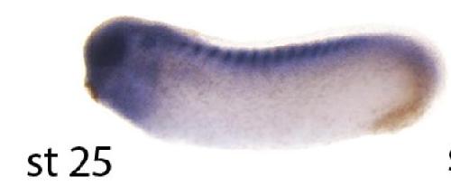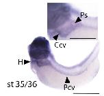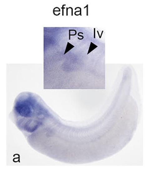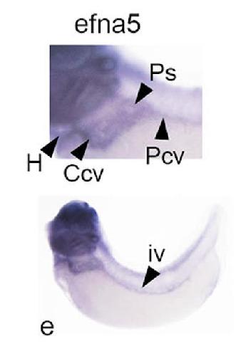 Supplemental Fig. 1. [efna4 and efna5] Expression of genes encoding ephrin-a ligands at stages of pronephric development from kidney field (neurula stages 17-18) to functional pronephros (early tadpole stage 35/36), except for efna3 that is shown in detail in Fig.3. Anterior, dorsal and lateral views are shown at neurula stages (stages 17-18, 20). Only lateral views are shown for tailbud stages 25, 28 and 32. A lateral view with the enlarged pronephric region is shown at early tadpole stage 35/36. From stage 25 onward, low levels of efna1 and a4 expression are detected at the level of the pronephric primordium, possibly in the associated developing vasculature. .... Expression of efna5 in the pronephric region is observed in the pronephric sinus (Ps). It is also observed in the vascular system, the intersomitic veins (Iv), the posterior cardinal vein (Pcv), the common cardinal vein (Ccv) and the heart (H). .....Scale bars: 1.7 mm for whole embryo, 0.5 mm for embryonic magnification. |