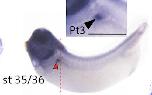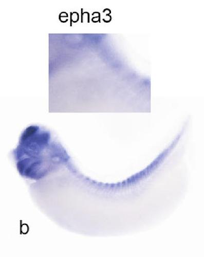 ephb3 (EPH receptor B3) gene expression in X. laevis embryo, assayed whole-mount via situ hybridization (WISH) at NF stage 35 & 36, lateral view, anterior left, dorsal up. |