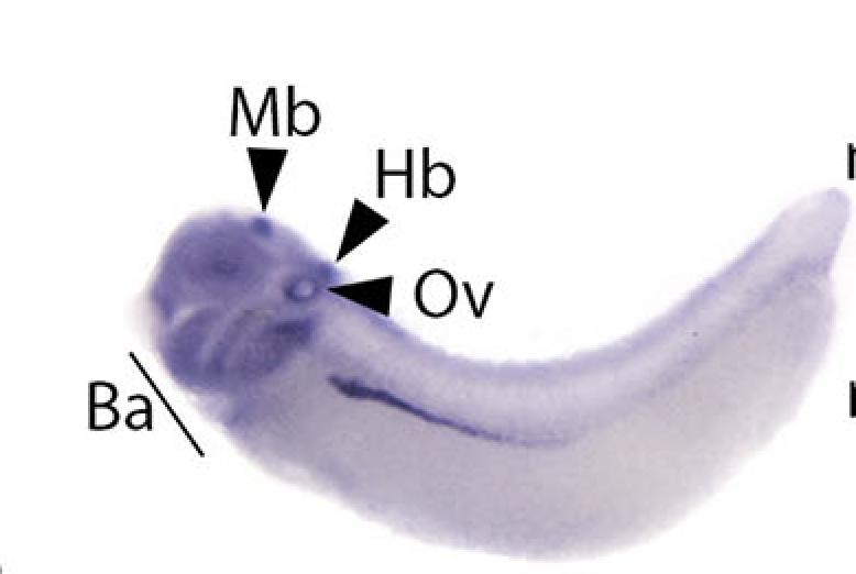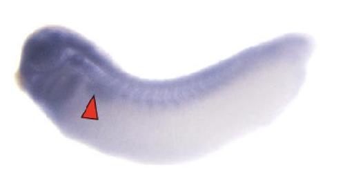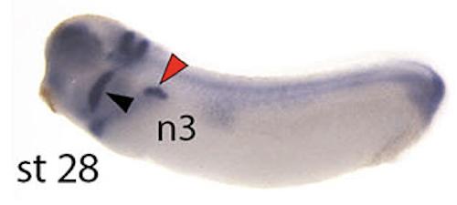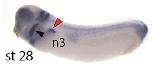 efnb3 (ephrin B3) gene expression in X. laevis embryo, assayed whole-mount via situ hybridization (WISH) at NF stage 28, lateral view anterior left, dorsal up. |