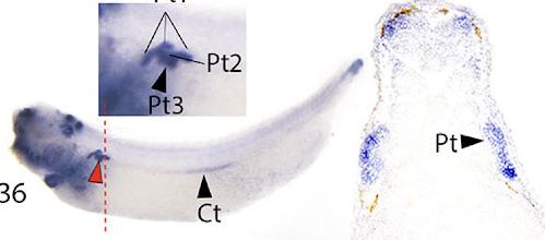 efna4 (ephrin A4) gene expression in X. laevis embryo, assayed whole-mount via situ hybridization (WISH) at NF stage 35 & 36, left image: lateral view, anterior left, dorsal up. right image, in transverse section at leel indicted by red dashed line. |