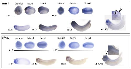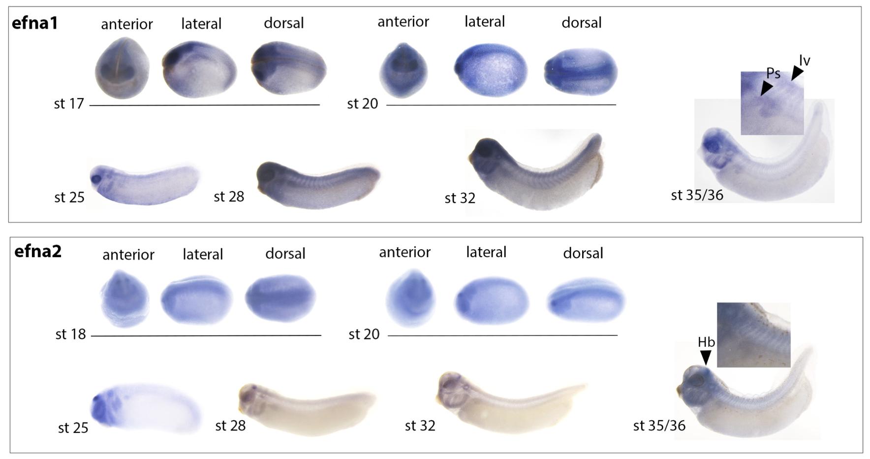 Supplemental Fig. 1. [efna1 and efna2] Expression of genes encoding ephrin-a ligands at stages of pronephric development from kidney field (neurula stages 17-18) to functional pronephros (early tadpole stage 35/36), except for efna3 that is shown in detail in Fig.3. Anterior, dorsal and lateral views are shown at neurula stages (stages 17-18, 20). Only lateral views are shown for tailbud stages 25, 28 and 32. A lateral view with the enlarged pronephric region is shown at early tadpole stage 35/36. From stage 25 onward, low levels of efna1 [and efna4] expression are detected at the level of the pronephric primordium, possibly in the associated developing vasculature. At the early tadpole stage (stage 35/36), efna1 is expressed in the vasculature associated to the pronephric region. .... Expression of efna2 is detected in the Hindbrain (Hb) at stage 35/36. Scale bars: 1.7 mm for whole embryo, 0.5 mm for embryonic magnification. |