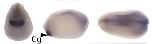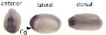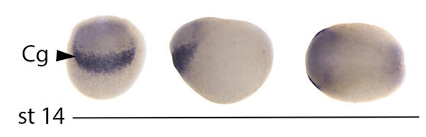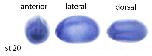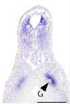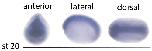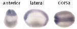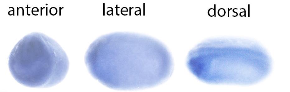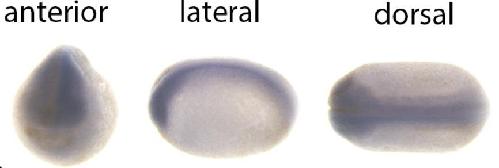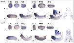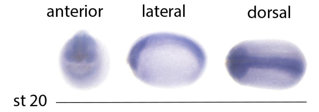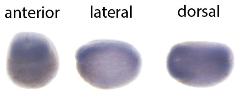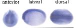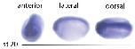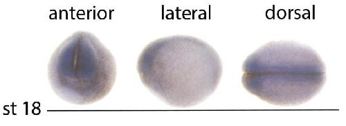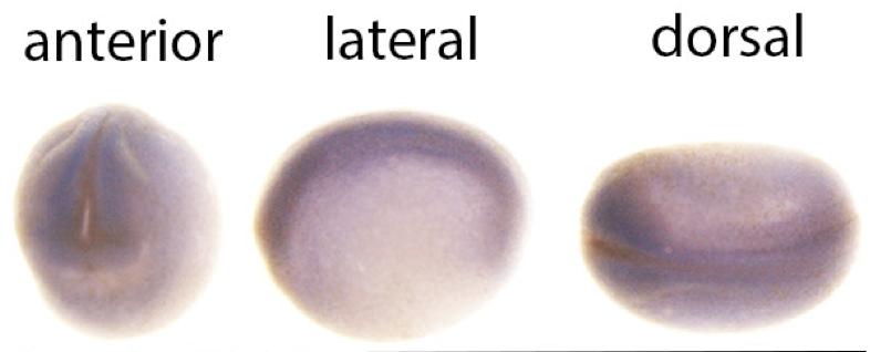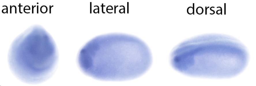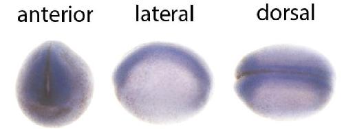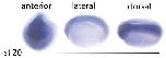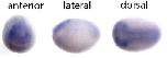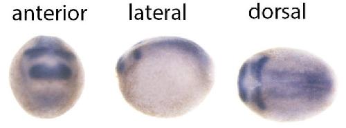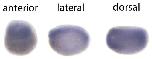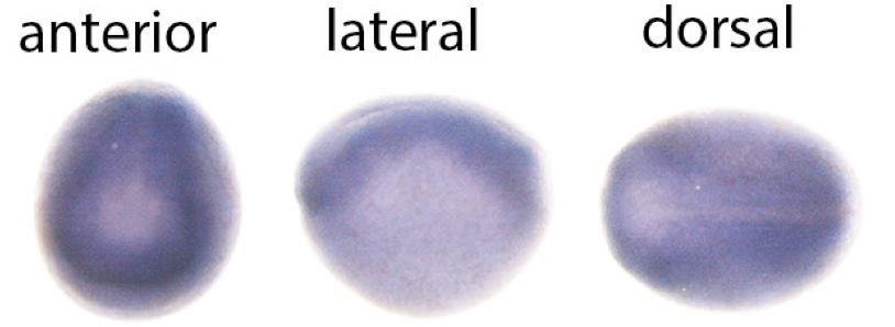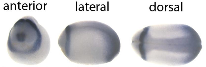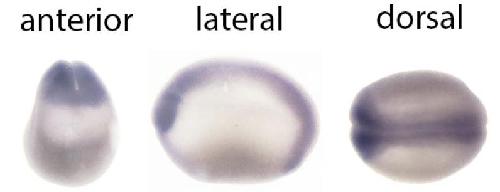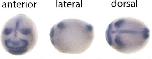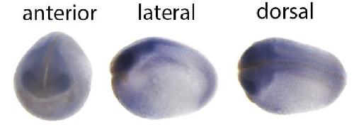 efnb1 (ephrin B1) gene expression in X. laevis embryo, assayed whole-mount via in situ hybridization (WISH) at NF stage 20, nterior, lateral and dorsal views. |