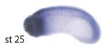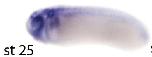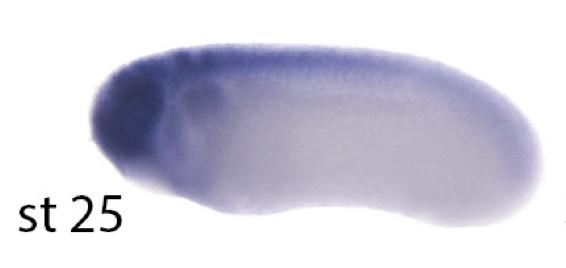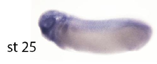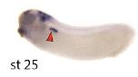 efna1 (ephrin A1) gene expression in X. laevis embryo, assayed whole-mount via situ hybridization (WISH) at NF stage 25, lateral view, anterior left, dorsal up. |