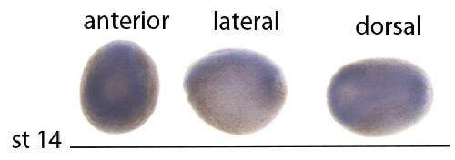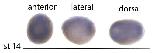 efnb1 (ephrin B1) gene expression in X. laevis embryo, assayed whole-mount via in situ hybridization (WISH) at NF stage 14, anterior, lateral and dorsal views. |