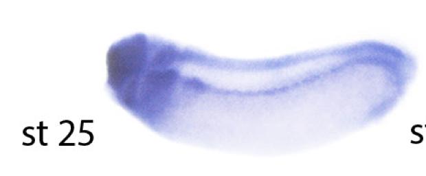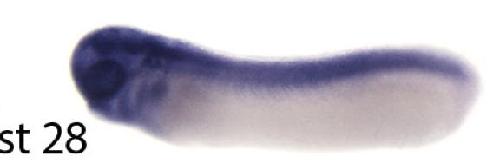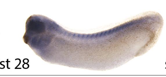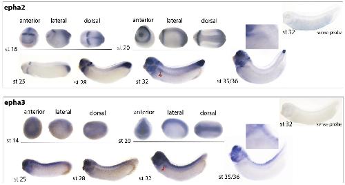 Supplemental Fig. 3. [epha2 and epha3] Expression of genes encoding receptors epha2, epha3, ..... at stages of pronephric development from kidney field (neurula stages 14-18) to functional pronephros (early tadpole stage 35/36). Anterior, dorsal and lateral views are shown at neurula stages (st14-18 and 20). Only lateral views are shown for tailbud stages 25, 28 and 32. A lateral view with the enlarged pronephric region is shown at early tadpole stage 35/36. Expression of epha2, a3 and a5 is observed in the region of the developing pronephros from stage 32 onward. .... For epha2, and epha3 .... in situ hybridization with the sense probes was shown at stage 32 as control. Scale bar: 1.7 mm for whole embryo, 0.5 mm for embryo magnification. |