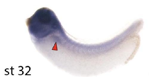 Supplemental Fig. 4. [epha8 and epha10] Expression of genes encoding receptors epha8, epha10, ..... at stages of pronephric development from kidney field (neurula stages 16-18) to functional pronephros (early tadpole stage 35/36). Anterior, dorsal and lateral views are shown at neurula stages (st16-18 and 20). Only lateral views are shown for tailbud stages 25, 28 and 32. A lateral view with the enlarged pronephric region is shown at early tadpole stage 35/36. Images of sectioned st 35/36 embryos are shown for epha10... with red dotted lines indicating the corresponding levels on whole mounts (note that the sections were not made from the whole mount specimen shown). Epha8 expression is observed in the developing pronephros (red arrowhead) from tailbud stage 28, while epha10 is transiently detected in the pronephros (red arrowhead) from tailbud stage 25 to 32. At tadpole stage 35/36 epha10 is not anymore expressed in pronephros, but rather in migrating hypaxial myoblasts (Myo). ..... Scale bar: 1.7 mm for whole embryo, 0.5 mm for embryo magnification and 280 μm for section. |