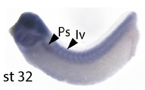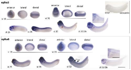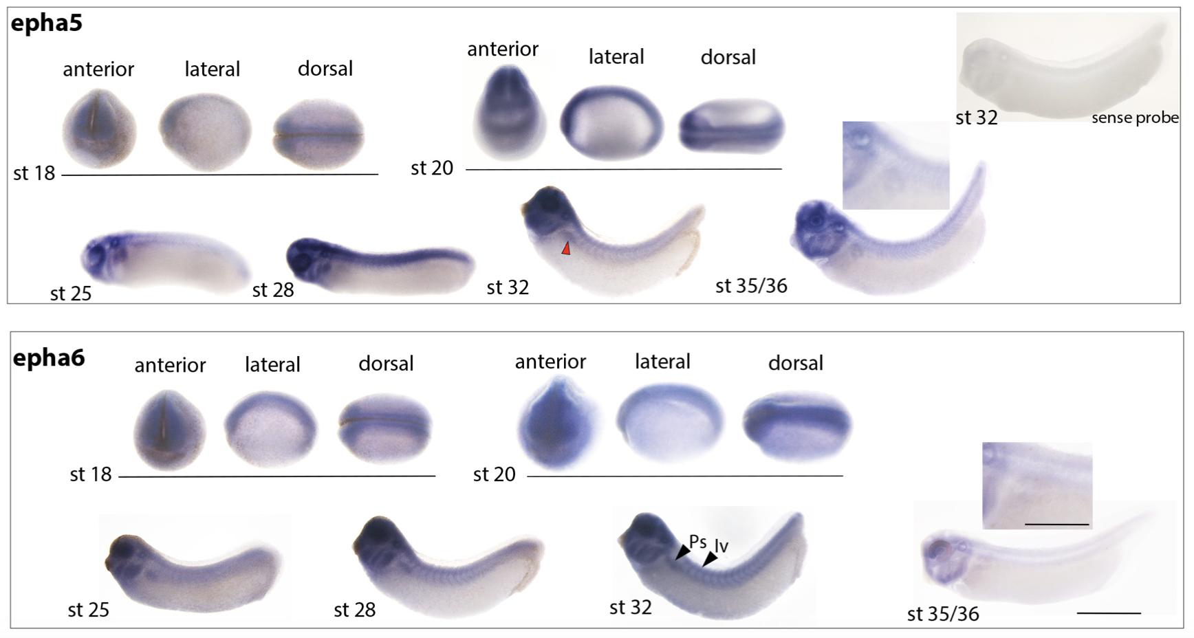 Supplemental Fig. 3.[epha5 and epha6] Expression of genes encoding receptors ..... epha5 and epha6 at stages of pronephric development from kidney field (neurula stages 14-18) to functional pronephros (early tadpole stage 35/36). Anterior, dorsal and lateral views are shown at neurula stages (st14-18 and 20). Only lateral views are shown for tailbud stages 25, 28 and 32. A lateral view with the enlarged pronephric region is shown at early tadpole stage 35/36. Expression of epha2, a3 and a5 is observed in the region of the developing pronephros from stage 32 onward. Epha6 is detected as soon as the tailbud stage 25. At stage 32 it is detected in the forming intersomitic veins (Iv) and pronephric sinus (Ps). For epha5, in situ hybridization with the sense probes was shown at stage 32 as control. Scale bar: 1.7 mm for whole embryo, 0.5 mm for embryo magnification. |