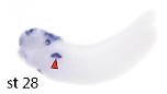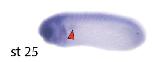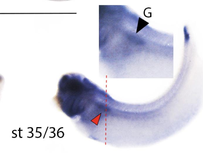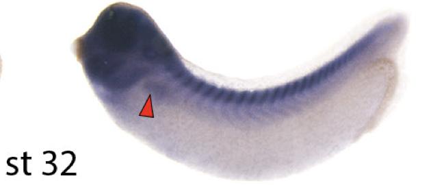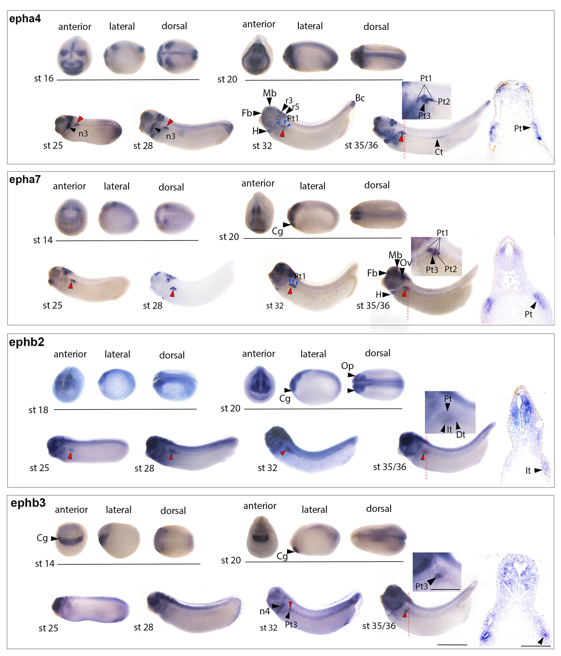 Supplemental Fig. 2. [efnb3] Expression of genes encoding ephrin-b ligands at stages of pronephric development from kidney field (neurula stages 14-18) to functional pronephros (early tadpole stage 35/36). Anterior, dorsal and lateral views are shown at neurula stages (st14-18 and 20). Only lateral views are shown for tailbud stages 25, 28 and 32. A lateral view with the enlarged pronephric region is shown at early tadpole stage 35/36. ....Efnb3 is not expressed in the developing pronephros. The red arrowheads indicate the pronephric anlage at stage 28 and the pronephros at stage 32 and 35/36. Scale bars: 1.7 mm for whole embryo, 0.5 mm for embryonic magnification and 280 μm for section. |