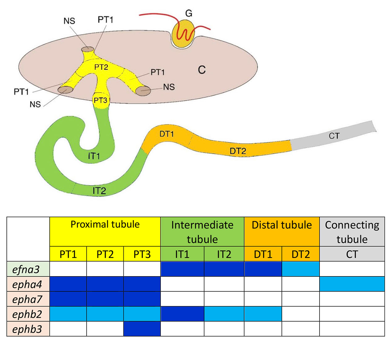 Schematic representation of the pronephros and table (inspired by Raciti el al., 2008); Ephrin ligands are outlined in green and Eph receptors in light orange. Dark blue: strong expression. Turquoise blue: middle expression. Efnb2 expression is detected in the glomus at stage 35/36 and not in the tubule and is therefore not included in the table. |