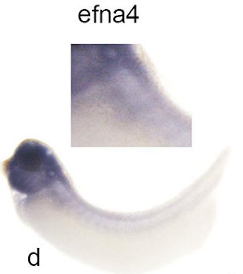 efna5 (ephrin A5) gene expression in X. laevis embryo, assayed whole-mount via in situ hybridization (WISH) at NF stage 35 & 36, lateral view anterior left, dorsal up. |