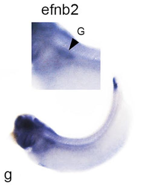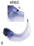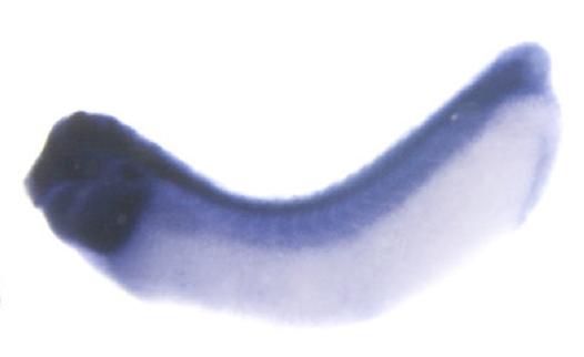 efnb2 (ephrin B2) gene expression in X. laevis embryo, assayed whole-mount via situ hybridization (WISH) at NF stage 25, lateral view anterior left, dorsal up. |