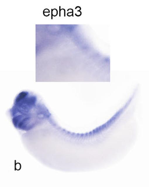 ephb3 (EPH receptor B3) gene expression in X. laevis embryo, assayed whole-mount via situ hybridization (WISH) at NF stage 28, lateral view, anterior left, dorsal up. |