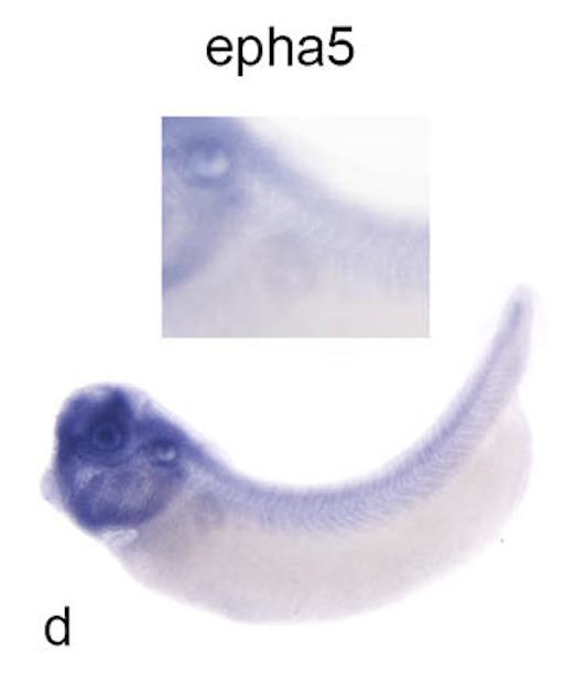 epha5 (EPH receptor A5) gene expression in X. laevis embryo, assayed whole-mount via situ hybridization (WISH) at NF stage 28, lateral view anterior left, dorsal up. |