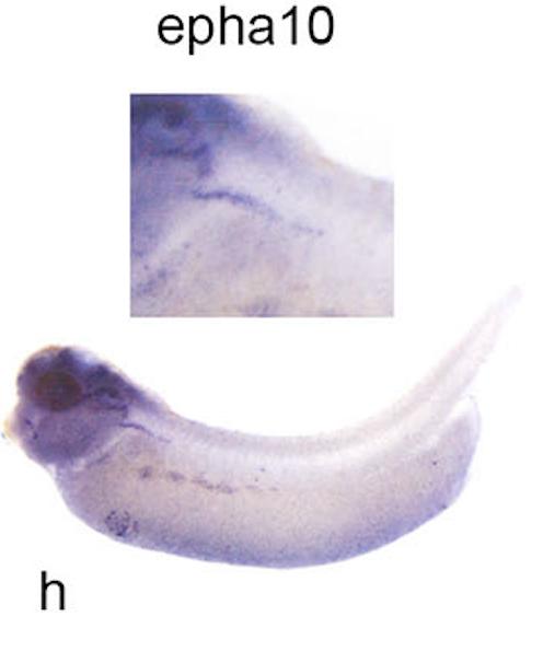 epha10 (EPH receptor A10) gene expression in X. laevis embryo, assayed whole-mount via situ hybridization (WISH) at NF stage 32, lateral view anterior left, dorsal up.