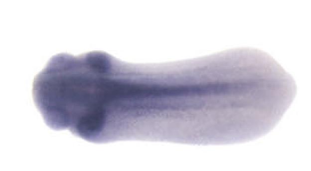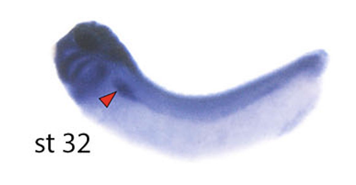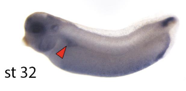 efnb1 (ephrin B1) gene expression in X. laevis embryo, assayed whole-mount via in situ hybridization (WISH) at NF stage 32, lateral view anterior left, dorsal up. |