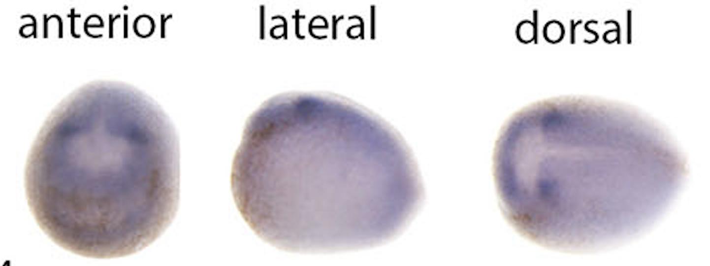 efna4 (ephrin A4) gene expression in X. laevis embryo, assayed whole-mount via situ hybridization (WISH) at NF stage 20, anterior, lateral and dorsal views. |