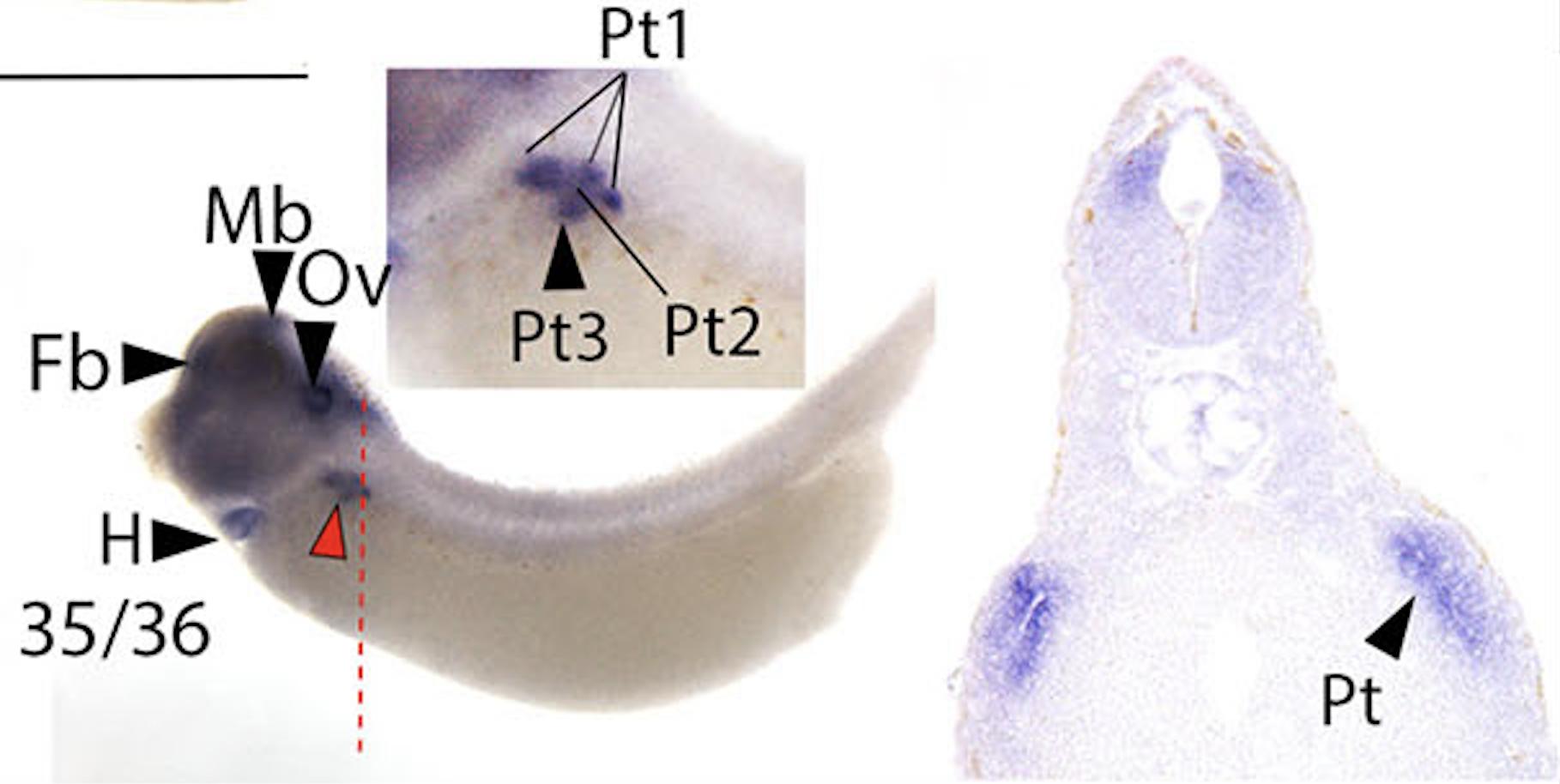 epha7 (EPH receptor A7) gene expression in X. laevis embryo, assayed whole-mount via situ hybridization (WISH) at NF stage 35 & 36, left image: lateral view, anterior left, dorsal up; right image: transverse section through trunk as level of red line. |