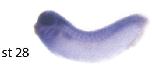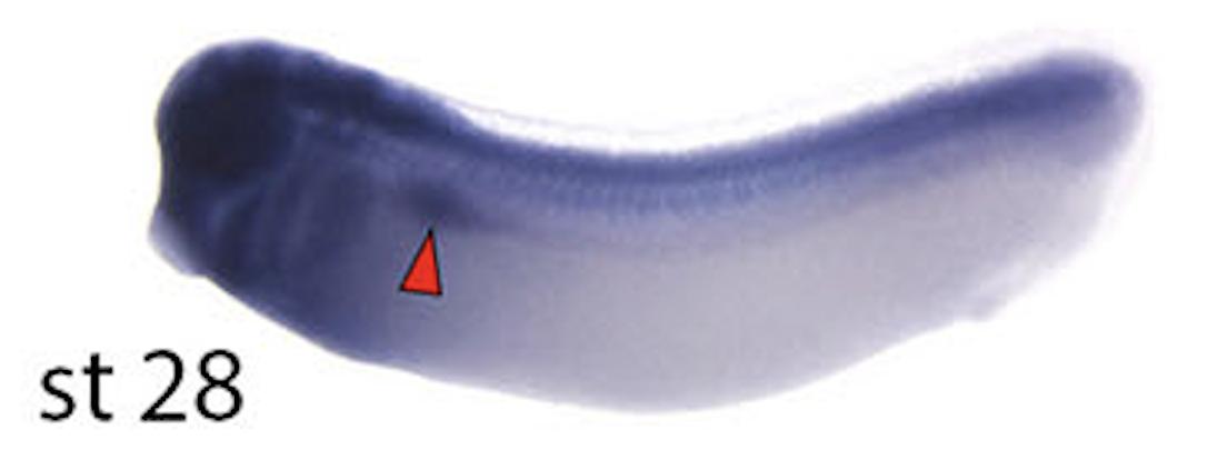 efna1 (ephrin A1) gene expression in X. laevis embryo, assayed whole-mount via situ hybridization (WISH) at NF stage 28, lateral view, anterior left, dorsal up. |