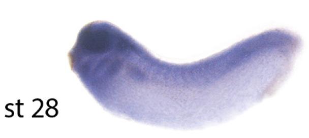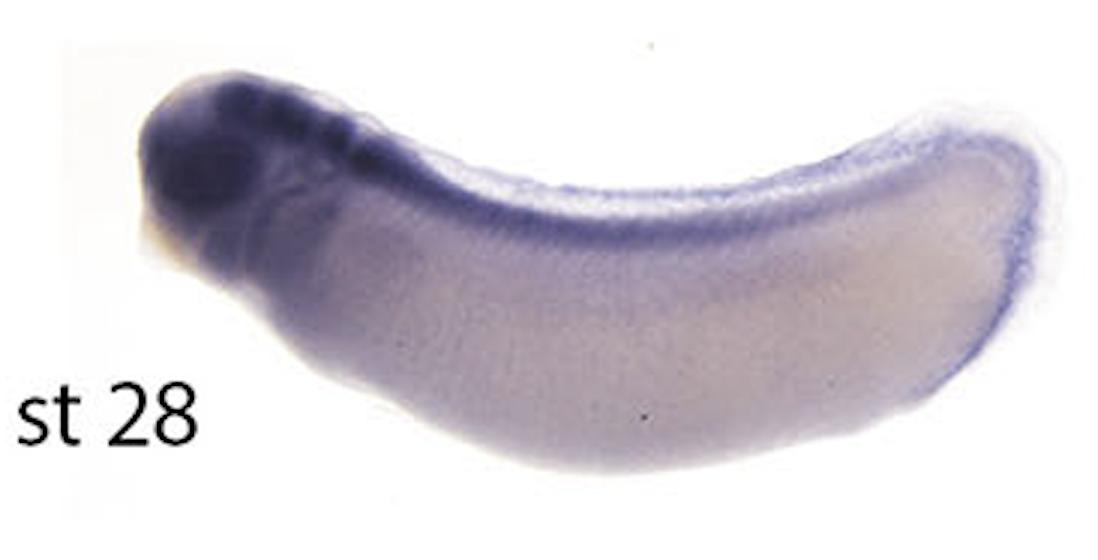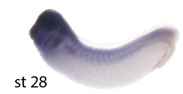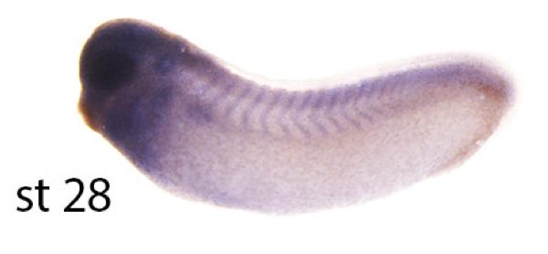 efna2 (ephrin A2) gene expression in X. laevis embryo, assayed whole-mount via situ hybridization (WISH) at NF stage 28, lateral view anterior left, dorsal up. |