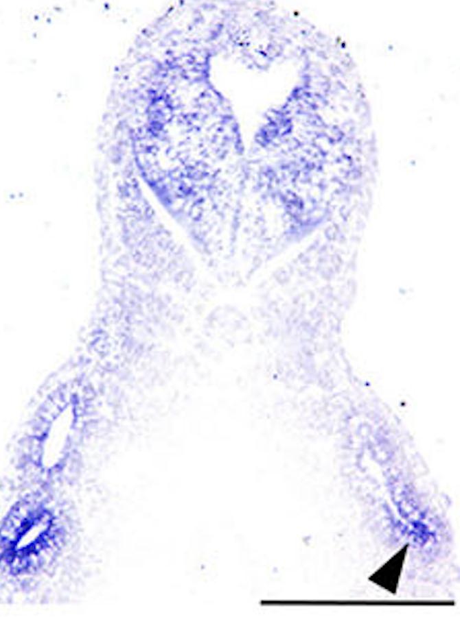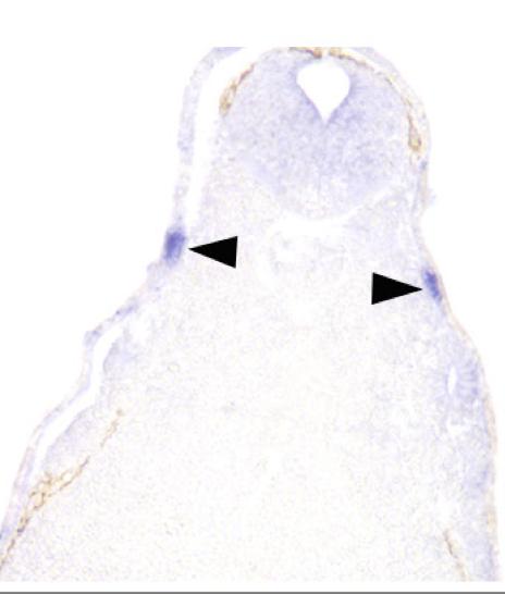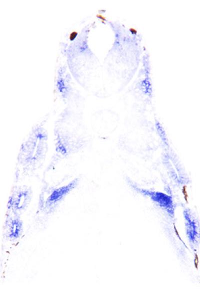 ephb3 (EPH receptor B3) gene expression in X. laevis embryo, assayed whole-mount via situ hybridization (WISH) at NF stage 35 & 36, transverse section through trunk, at level of the pronephros, dorsal up. |