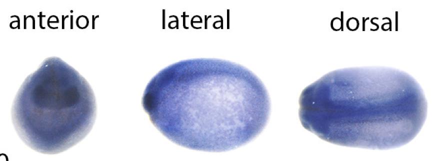 efna4 (ephrin A4) gene expression in X. laevis embryo, assayed whole-mount via situ hybridization (WISH) at NF stage 16, anterior, lateral and dorsal views. |