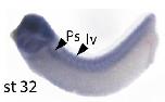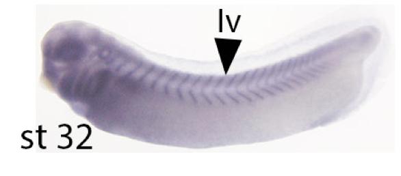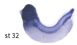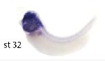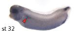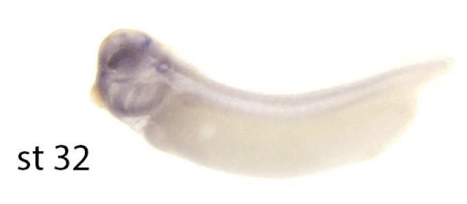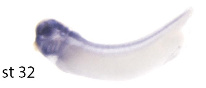 efna4 (ephrin A4) gene expression in X. laevis embryo, assayed whole-mount via in situ hybridization (WISH) at NF stage 32, lateral view anterior left, dorsal up. |