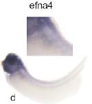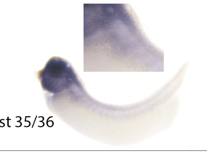 efna1 (ephrin A1) gene expression in X. laevis embryo, assayed whole-mount via situ hybridization (WISH) at NF stage 35 & 36, lateral view, anterior left, dorsal up. |