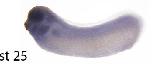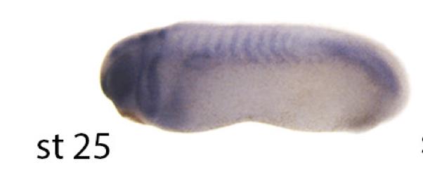 efna3 (ephrin A3) gene expression in X. laevis embryo, assayed whole-mount via situ hybridization (WISH) at NF stage 25, dorsal view, anterior left, showing expression in craniial neural crest streams of the first pharygeal arch around the eye, dorsal aspects of neural tube and as well as the third and fourth pharyngeal arches . |