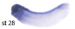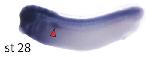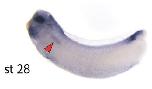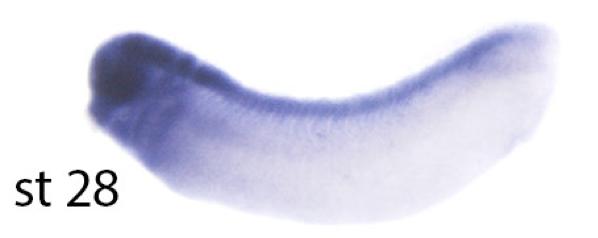 efna4 (ephrin A4) gene expression in X. laevis embryo, assayed whole-mount via in situ hybridization (WISH) at NF stage 28, lateral view anterior left, dorsal up. |