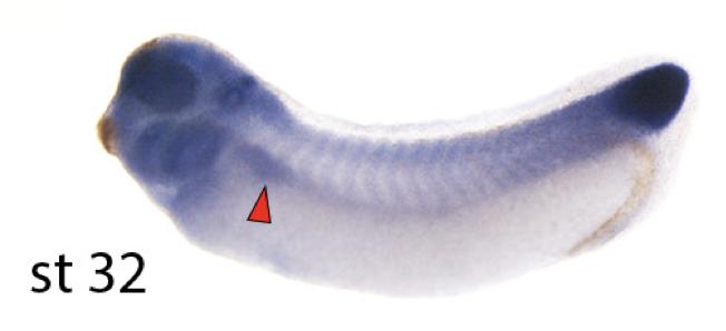 efnb2 (ephrin B2) gene expression in X. laevis embryo, assayed whole-mount via situ hybridization (WISH) at NF stage 32, lateral view anterior left, dorsal up. |
