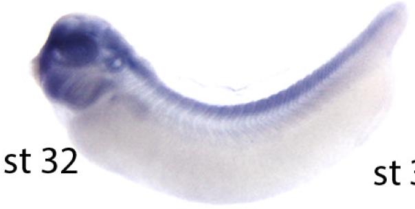 efna2 (ephrin A2) gene expression in X. laevis embryo, assayed whole-mount via situ hybridization (WISH) at NF stage 32, lateral view anterior left, dorsal up. |