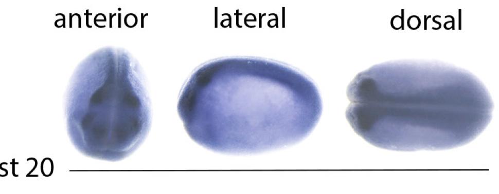 efna2 (ephrin A2) gene expression in X. laevis embryo, assayed whole-mount via situ hybridization (WISH) at NF stage 20, anterior, lateral and dorsal views. |