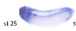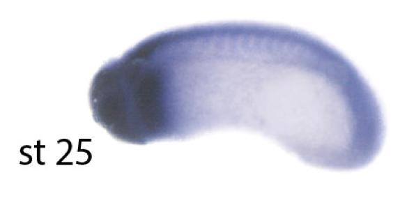 efna4 (ephrin A4) gene expression in X. laevis embryo, assayed whole-mount via in situ hybridization (WISH) at NF stage 25, lateral view anterior left, dorsal up. |