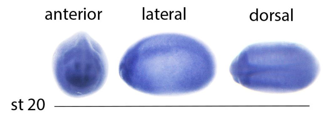 epha2 (EPH receptor A2) gene expression in X. laevis embryo, assayed whole-mount via situ hybridization (WISH) at NF stage 20, anterior, lateral and dorsal views.