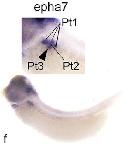 epha7 (EPH receptor A7) gene expression in X. laevis embryo, assayed whole-mount via situ hybridization (WISH) at NF stage 32, lateral view, anterior left, dorsal up. |