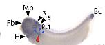 efnb2 (ephrin B2) gene expression in X. laevis embryo, assayed whole-mount via situ hybridization (WISH) at NF stage 15, anterior, lateral view and dorsal views. |