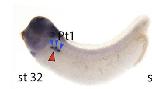 Supplemental Fig. 4. [ephb1 and ephb4]. Expression of genes encoding receptors ephb1 and ephb4 at stages of pronephric development from kidney field (neurula stages 16-18) to functional pronephros (early tadpole stage 35/36). Anterior, dorsal and lateral views are shown at neurula stages (st16-18 and 20). Only lateral views are shown for tailbud stages 25, 28 and 32. A lateral view with the enlarged pronephric region is shown at early tadpole stage 35/36. Images of sectioned st 35/36 embryos are shown for .... ephb1 and ephb4 with red dotted lines indicating the corresponding levels on whole mounts (note that the sections were not made from the whole mount specimen shown)......