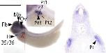 efnb3 (ephrin B3) gene expression in X. laevis embryo, assayed whole-mount via situ hybridization (WISH) at NF stage 14, anterior, lateral and dorsal views. |