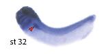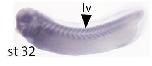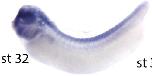 efnb3 (ephrin B3) gene expression in X. laevis embryo, assayed whole-mount via situ hybridization (WISH) at NF stage 32, lateral view anterior left, dorsal up. |